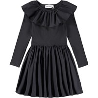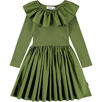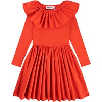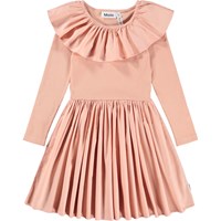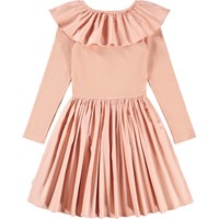 Roze knielange jurk gemaakt van biologisch katoen met een aansluitend jersey bovenstuk en een volumineuze rok van katoenen popeline. De jurk heeft lange mouwen en een grote popeline kraag die off-shoulder gedragen kan worden.