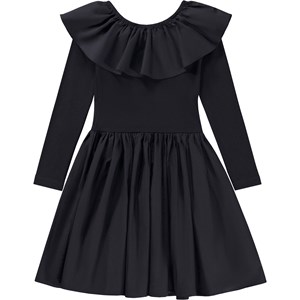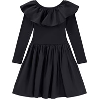 Zwarte midi-jurk van biologisch katoen met een aansluitend jersey bovenstuk en een volumineuze katoenen poplin rok. De jurk heeft lange mouwen en een poplin kraag die off-shoulder gedragen kan worden.