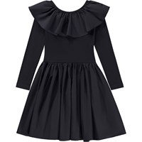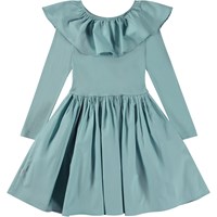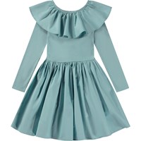 Lichtblauwe knielange jurk met lange mouwen en popeline kraag en rok. De popeline kraag heeft elastiek en kan op de schouder als kraag of off-shoulder als mouwen gedragen worden. De jurk is van 100% katoenen jersey, terwijl de kraag en rok van 100% katoenen popeline zijn. De jurk is slim fit.