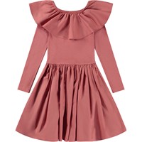Oudroze knielange jurk met lange mouwen en popeline kraag en rok. De popeline kraag heeft elastiek en kan op de schouder als kraag of off-shoulder als mouwen gedragen worden. De jurk is van 100% katoenen jersey, terwijl de kraag en rok van 100% katoenen popeline zijn. De jurk is slim fit.