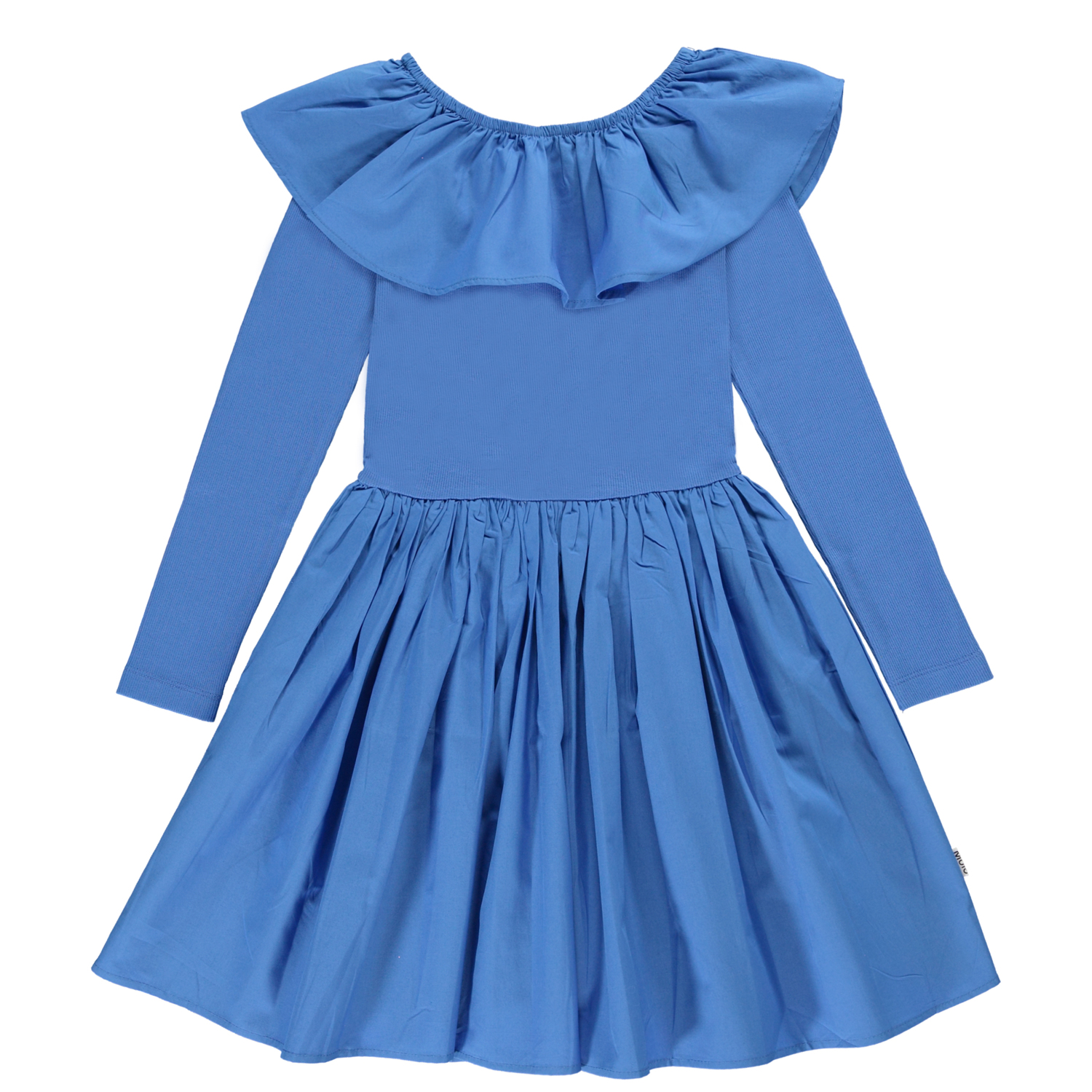 Cille is een blauwe ‘one of a kind’ jurk dat en comfortabel is en goed staat. De jurk heeft een rok, een top in rib met een grote kraag.