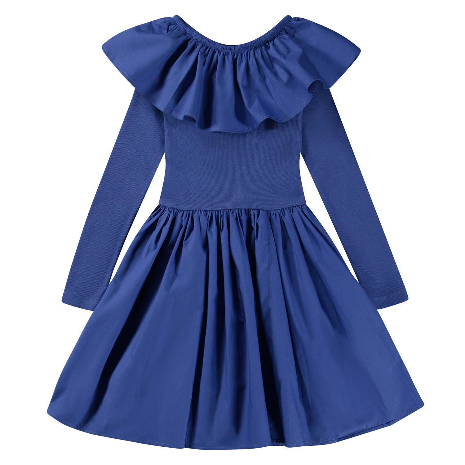 Helderblauwe knielange jurk met lange mouwen en popeline kraag en rok. De popeline kraag heeft elastiek en kan op de schouder als kraag of off-shoulder als mouwen gedragen worden. De jurk is van 100% katoenen jersey, terwijl de kraag en rok van 100% katoenen popeline zijn. De jurk is slim fit.