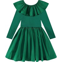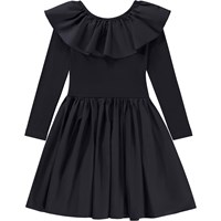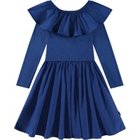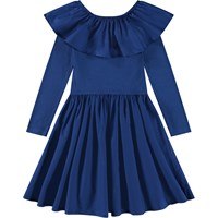 Donkerblauwe knielange jurk van biologisch katoen met een aansluitend jersey bovenstuk en een volumineuze katoenen poplin rok. De jurk heeft lange mouwen en een poplin kraag die off-shoulder gedragen kan worden.