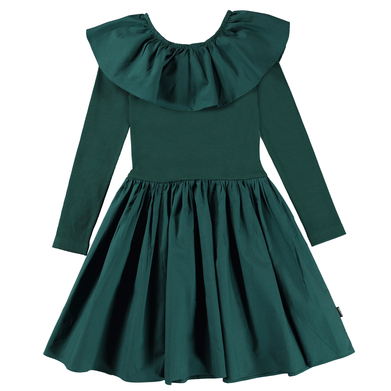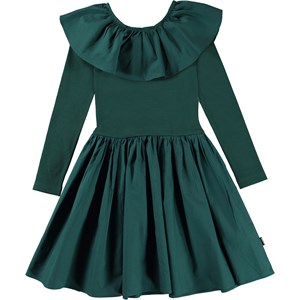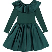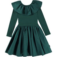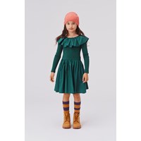 Cille is een donkergroene ‘one of a kind’ jurk dat en comfortabel is en goed staat. De jurk heeft een rok, een top in rib met een grote kraag.