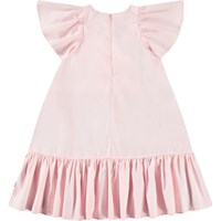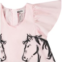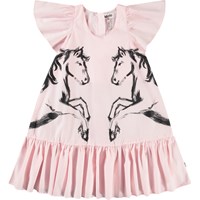 Roze jurk van biologisch katoen met vlindermouwen en ruches aan de onderkant. De jurk heeft een ruimvallende pasvorm, een blinde rits aan de achterkant en op de voorkant een zwarte print van paarden.