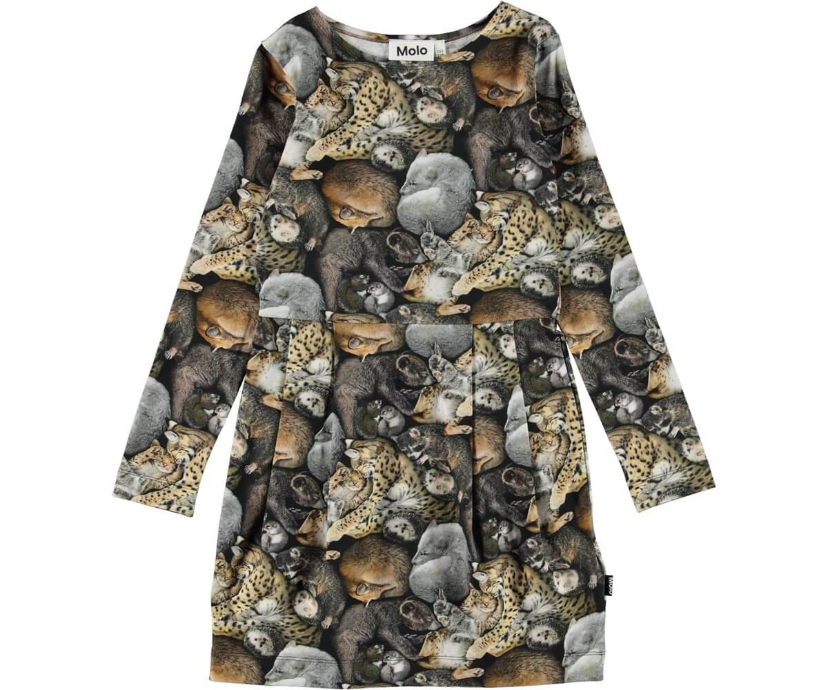 Cindarell is een jurk met een print van verschillende dieren die samen opgerold slapen. De jurk heeft lange mouwen en een mooi gevormde pasvorm zonder te strak te zitten.
