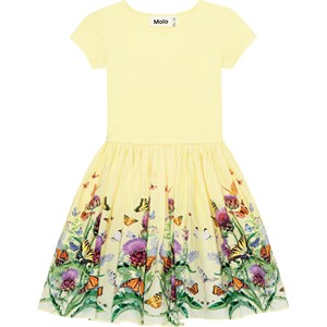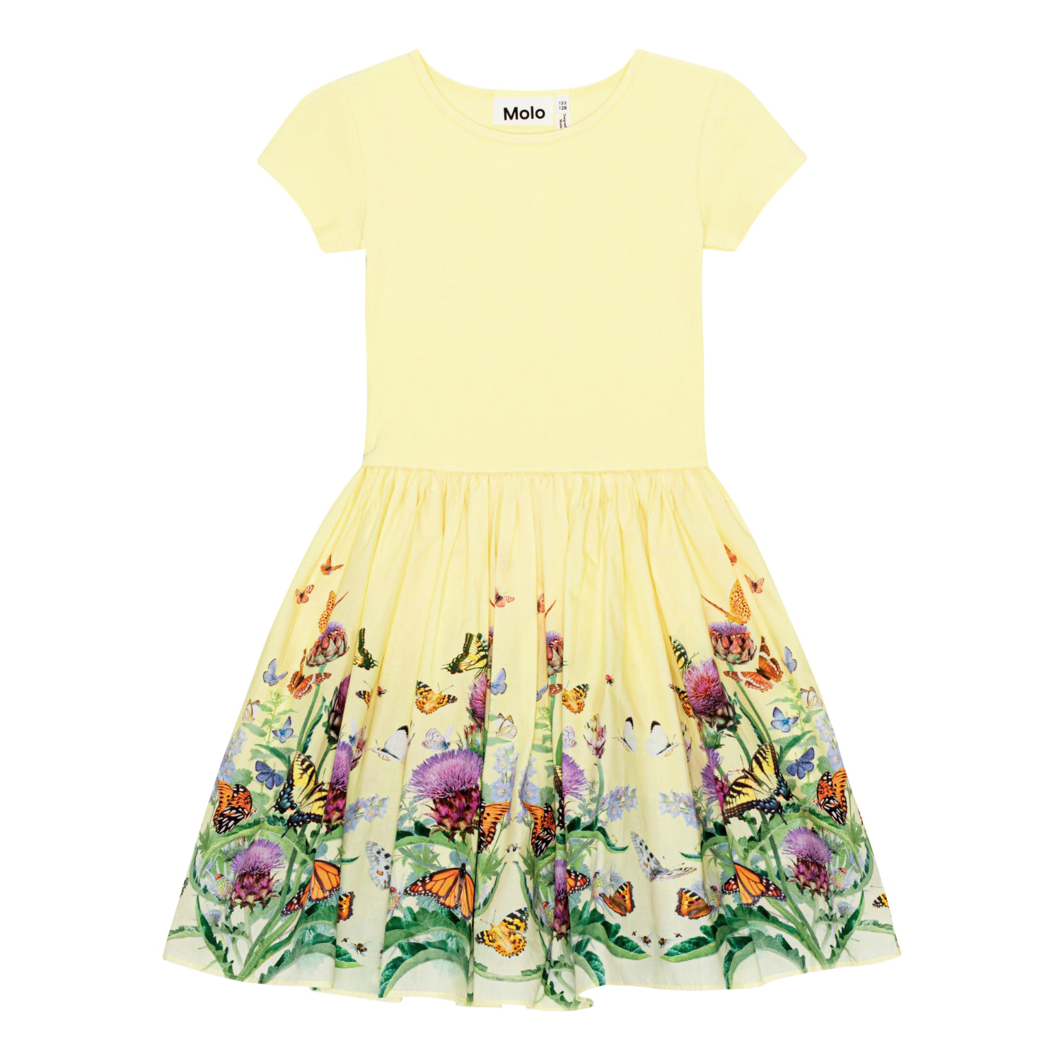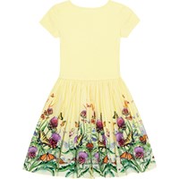 Paarse jurk met korte mouwen en cirkelrok van biologisch katoen. De top is van ribjersey en heeft een nauwsluitende pasvorm, terwijl de rok van katoenen popeline is met een artisjokbloemenprint.