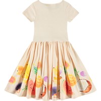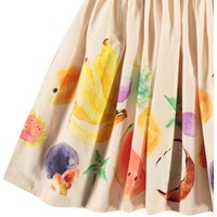 Beige jurk van biologisch katoen met korte mouwen en aansluitende top van ribjersey en poplin rok. De jurk heeft een normale pasvorm met op de rok een kleurrijke print van exotisch fruit.