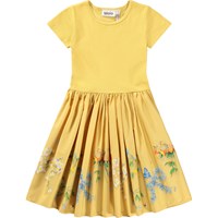Gele jurk met korte mouwen gemaakt van zacht biologisch katoen. Het bovenstuk heeft een aansluitende pasvorm van geribbelde jersey en de zachte poplin rok heeft een schattige print van planten en bloemen in de vorm van kleine strikjes. Het is een comfortabele en feestelijke jurk met veel bewegingsvrijheid.
