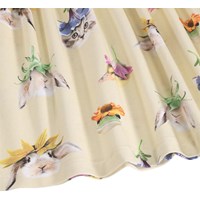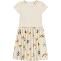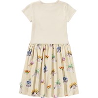 Gebroken witte jurk met korte mouwen gemaakt van zacht biologisch katoen. Het bovenstuk is aansluitend en gemaakt van geribbelde jersey en de rok is gemaakt van rekbare jersey met een schattige print van dieren met kleurrijke bloemenhoeden. Het is een comfortabele en feestelijke jurk met veel bewegingsvrijheid.