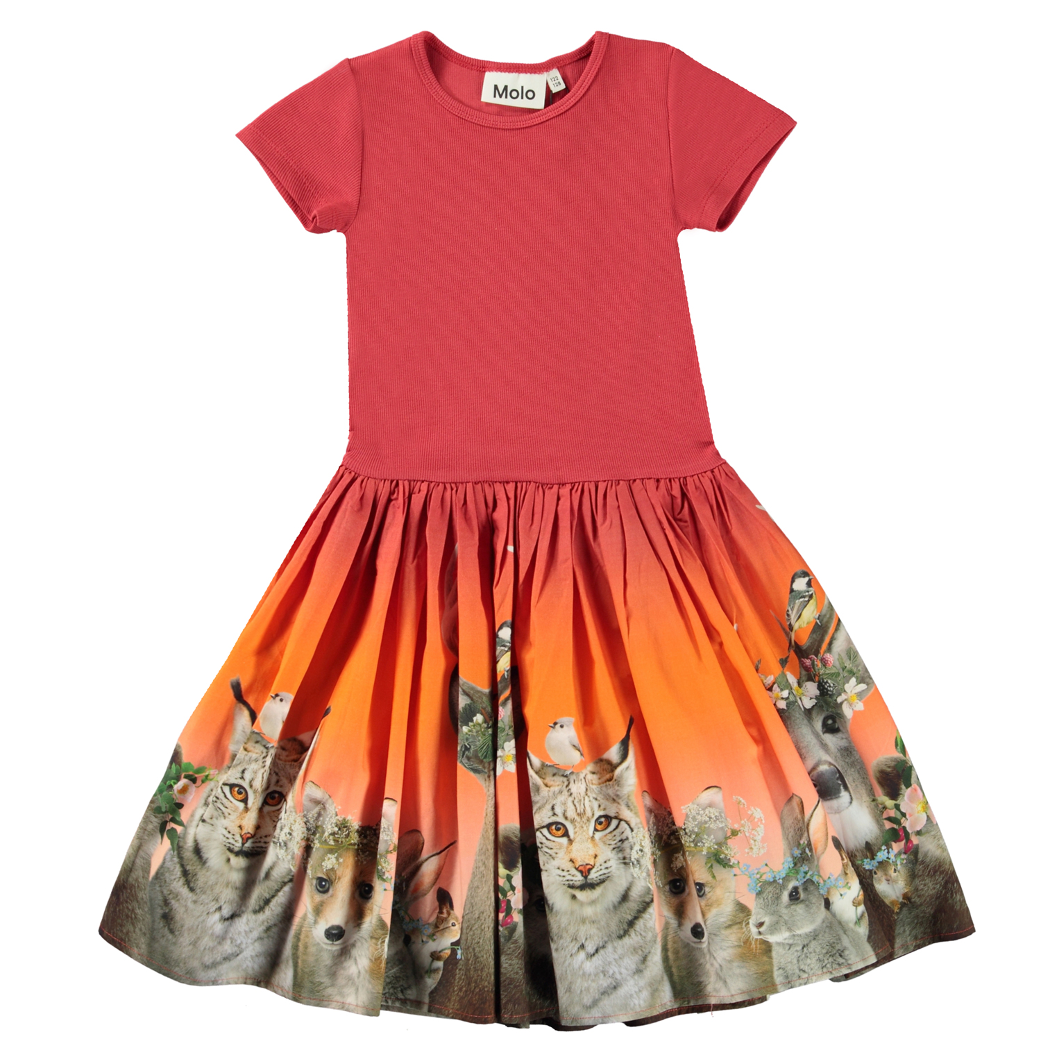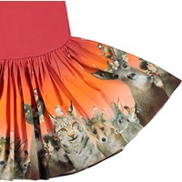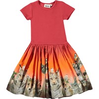 Cissa is een rode jurk in twee delen met een top met korte mouwen in rib. De rok heeft een print van verschillende dieren.