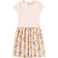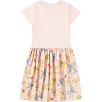 Roze jurk met korte mouwen gemaakt van zacht biologisch katoen. Het bovenstuk is aansluitend en gemaakt van geribbelde jersey en de rok is gemaakt van rekbare jersey met een schattige bloemenprint. Het is een comfortabele en feestelijke jurk met veel bewegingsvrijheid.