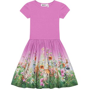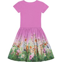 Paarse jurk met korte mouwen en cirkelrok van biologisch katoen. De top is van ribjersey en heeft een nauwsluitende pasvorm, terwijl de rok van katoenen popeline is met een print van tijgerwelpjes in een weide van wilde bloemen.