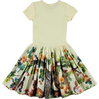 Cissa is een lichtgele jurk met korte mouwen in twee delen: de top is rib en de rok heeft een print van het bos en al zijn verschillende dieren.
