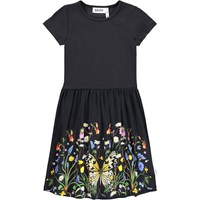 Zwarte jurk met korte mouwen gemaakt van zacht biologisch katoen. Het bovenstuk heeft een aansluitende pasvorm van geribbelde jersey en de rok is gemaakt van een rekbare jersey met een schattige print van bloemen en een vlinder. Het is een comfortabele en feestelijke jurk met veel bewegingsvrijheid.