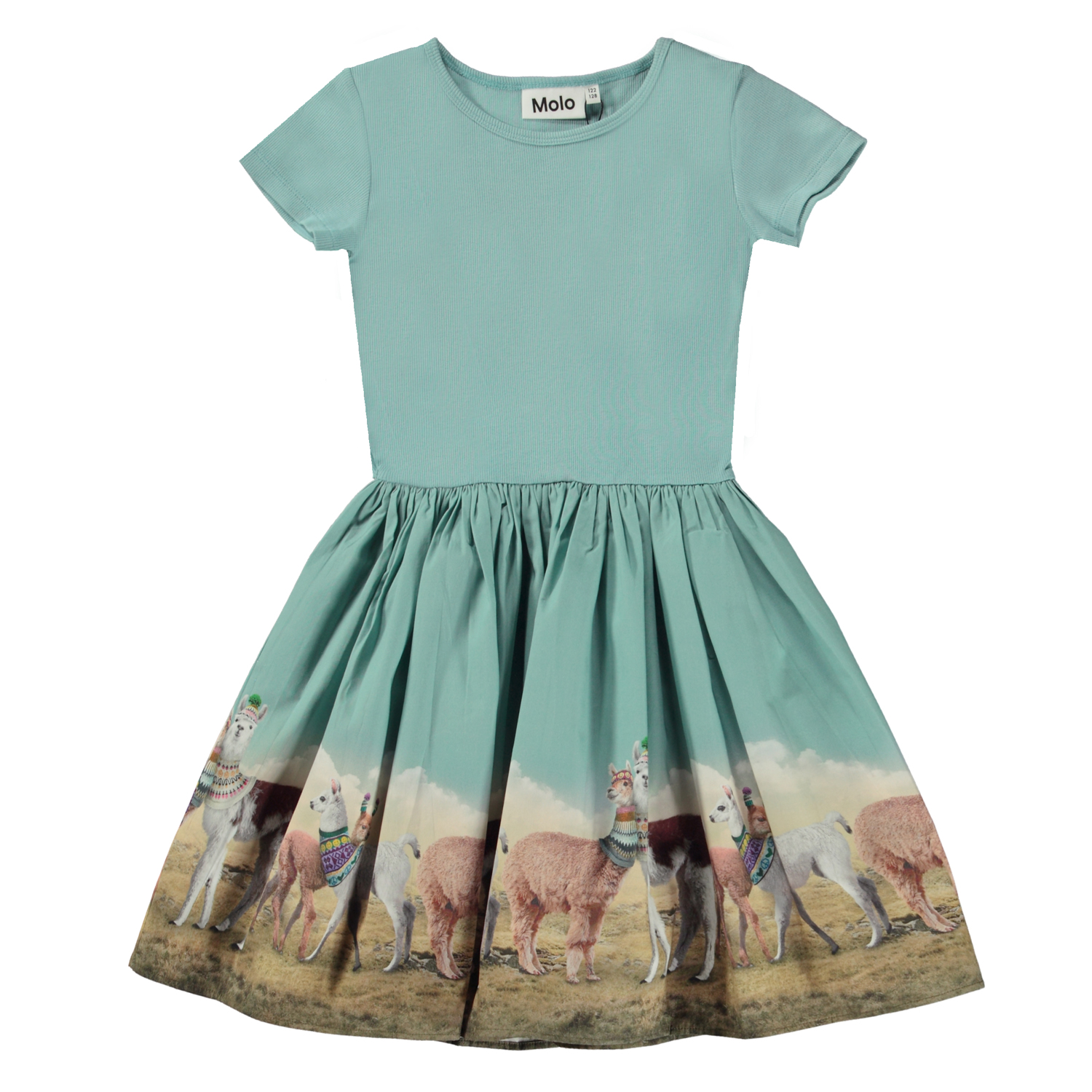 Blauwe knielange jurk met korte mouwen en popeline rok in lama print. De grappige print laat twee lama’s zien die Molo’s gebreide kleding dragen zoals mutsen, infinity sjaal en truien. Deze jurk is van 100% katoen, heeft een ronde hals, korte mouwen, een zeer volle popeline rok en het is slim fit.