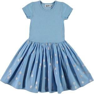 Cissa is een lichtblauwe jurk met korte mouwen in twee delen: de top is rib en de rok heeft een print van zilveren stippen.