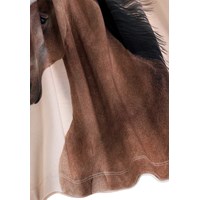 Roze jurk met korte mouwen gemaakt van zacht biologisch katoen. Het bovenstuk heeft een aansluitende pasvorm van geribbelde jersey en de rok is gemaakt van een rekbare jersey met een schattige print van een paard. Het is een comfortabele en feestelijke jurk met veel bewegingsvrijheid.