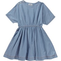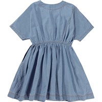 Clara is een blauwe knielange jurk van biologisch chambray katoen. De jurk heeft korte mouwen en een 3 knoops sluiting op één schouder. Clara heeft ook elastiek in de taille wat een mooi rimpeleffect geeft.