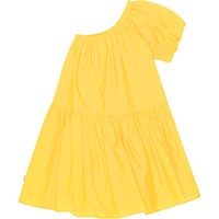 Gele one shoulder jurk van biologisch katoen. De bovenkant van de jurk heeft een pofmouw aan de rechterkant. Het is knielang en de geplooide rok geeft het veel volheid. De jurk is gemakkelijk te dragen en zeer comfortabel.