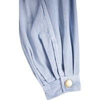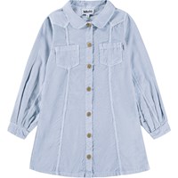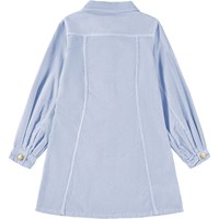 Jurk met lange mouwen gemaakt van biologisch lichtblauw fluweel. De jurk heeft een kleine kraag, messingkleurige drukknopen aan de voorkant, plooien, naden en twee zakken aan de voorkant. De jurk heeft plooien rond de pols en een bijpassende messingkleurige knoopsluiting.