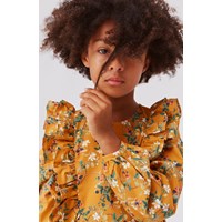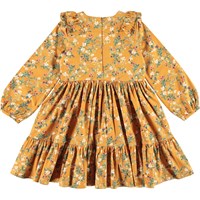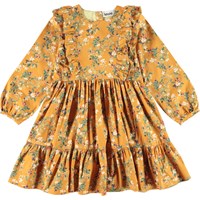 Clea is een gouden jurk met ene print van mooie bramenstruiken. De jurk heeft ruches aan de voorkant en een ritssluiting aan de achterkant.