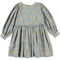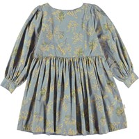Grijsblauwe knielange jurk met een bloemenprint. De print heeft de mooiste gele mimosa takken. Deze jurk is van 100% katoen, heeft een ronde hals, prinsessennaden, lange, volle mouwen met manchetten, een blinde rits op de rug en heeft een ruimvallende pasvorm.