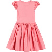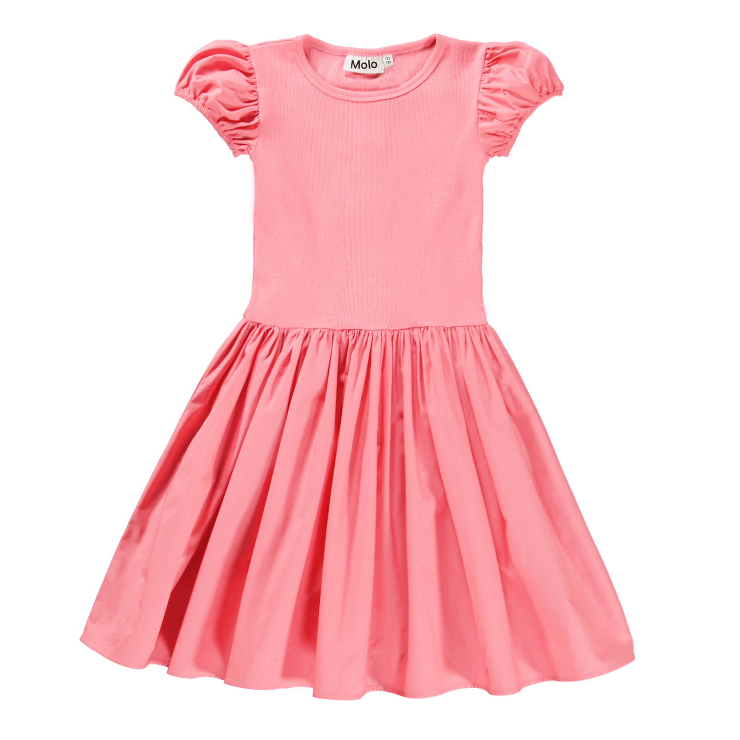 koraalkleurige jurk van biologisch katoen met korte mouwen en cirkelrok. De bovenkant van de jurk is gemaakt van aansluitende jersey, waardoor het comfortabel en gemakkelijk te dragen is. Het heeft een ronde hals en kleine pofmouwen met elastiek. De wijde rok en volumineuze mouwen zijn gemaakt van katoenen popeline.