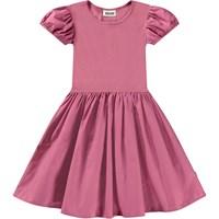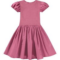 Roze jurk met korte mouwen van biologisch katoen met een aansluitend jersey bovenstuk en een volumineuze katoenen popeline rok. De jurk heeft een ronde hals en kleine opgeblazen mouwtjes met elastiek aan de onderkant.