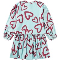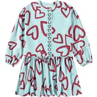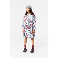 Lichtblauwe knielange jurk van zachte viscose in een ruimvallende pasvorm met een kleine mandarijnkraag die sluit met kleine parelmoer knoopjes aan de voorkant. De jurk heeft lange mouwen met knoopmanchetten en een kleine afwerking voegt een mooie touch toe aan de jurk. De jurk heeft een prachtige print van donkerrode handgeschilderde harten.