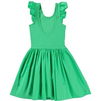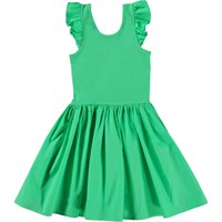 Cloudia is een groene knielange jurk van katoen. De jurk heeft een ronde poplin rok en ruches op de schouders. De top is in een rib jersey en heeft een laag uitgesneden rug.