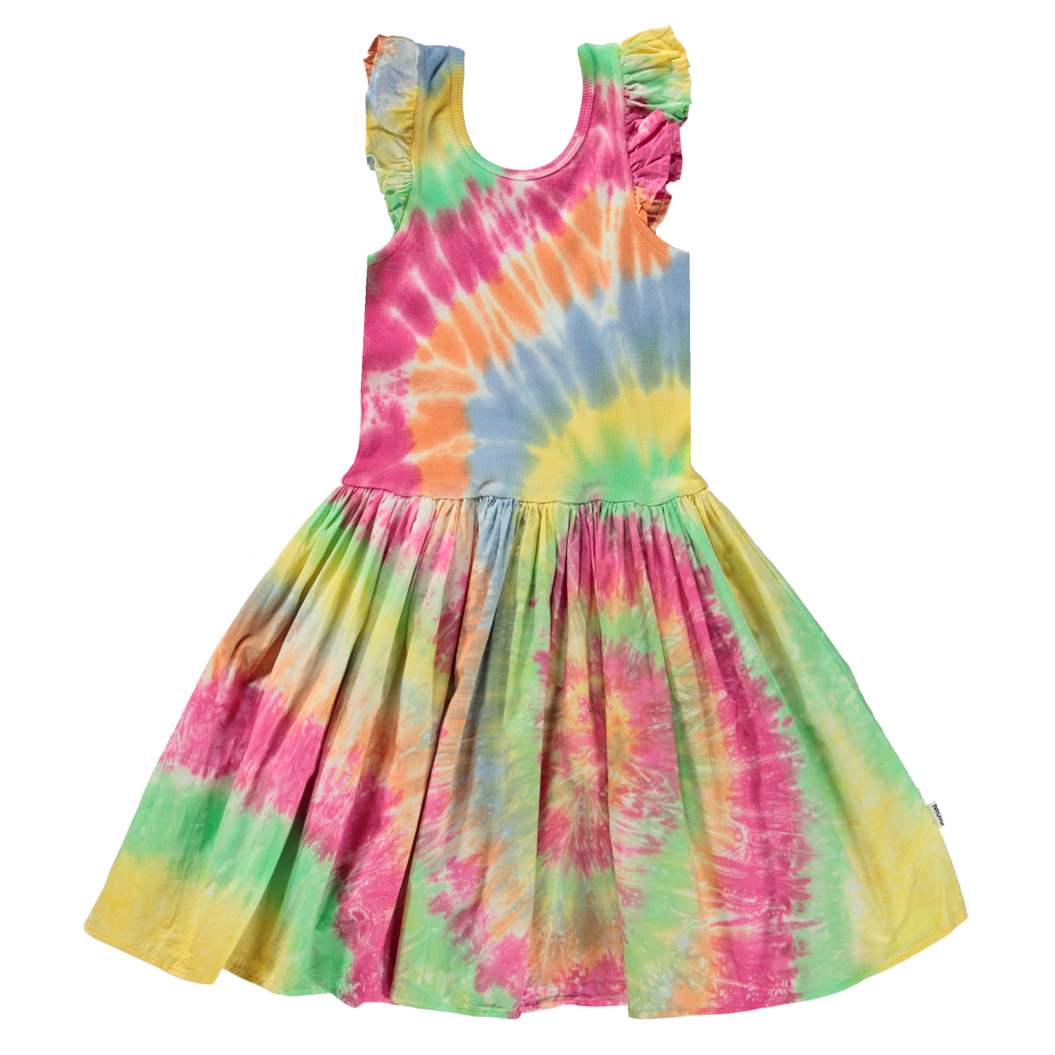 Cloudia is een knielange jurk van katoen in een tie-dye print in vele kleuren. De jurk heeft een ronde poplin rok en ruches op de schouders. De top is in een rib jersey en heeft een laag uitgesneden rug.