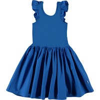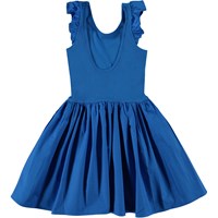 Cloudia is een donkerblauwe knielange jurk van katoen. De jurk heeft een ronde poplin rok en ruches op de schouders. De top is in een rib jersey en heeft een laag uitgesneden rug.