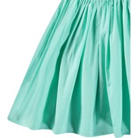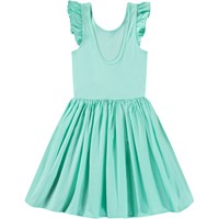 Mintgroene knielange jurk van biologisch katoen met poplin rok. De top van de jurk heeft een aansluitende katoenrib, ruches op de schouders en de jurk is aan de achterkant laag uitgesneden.