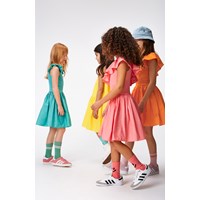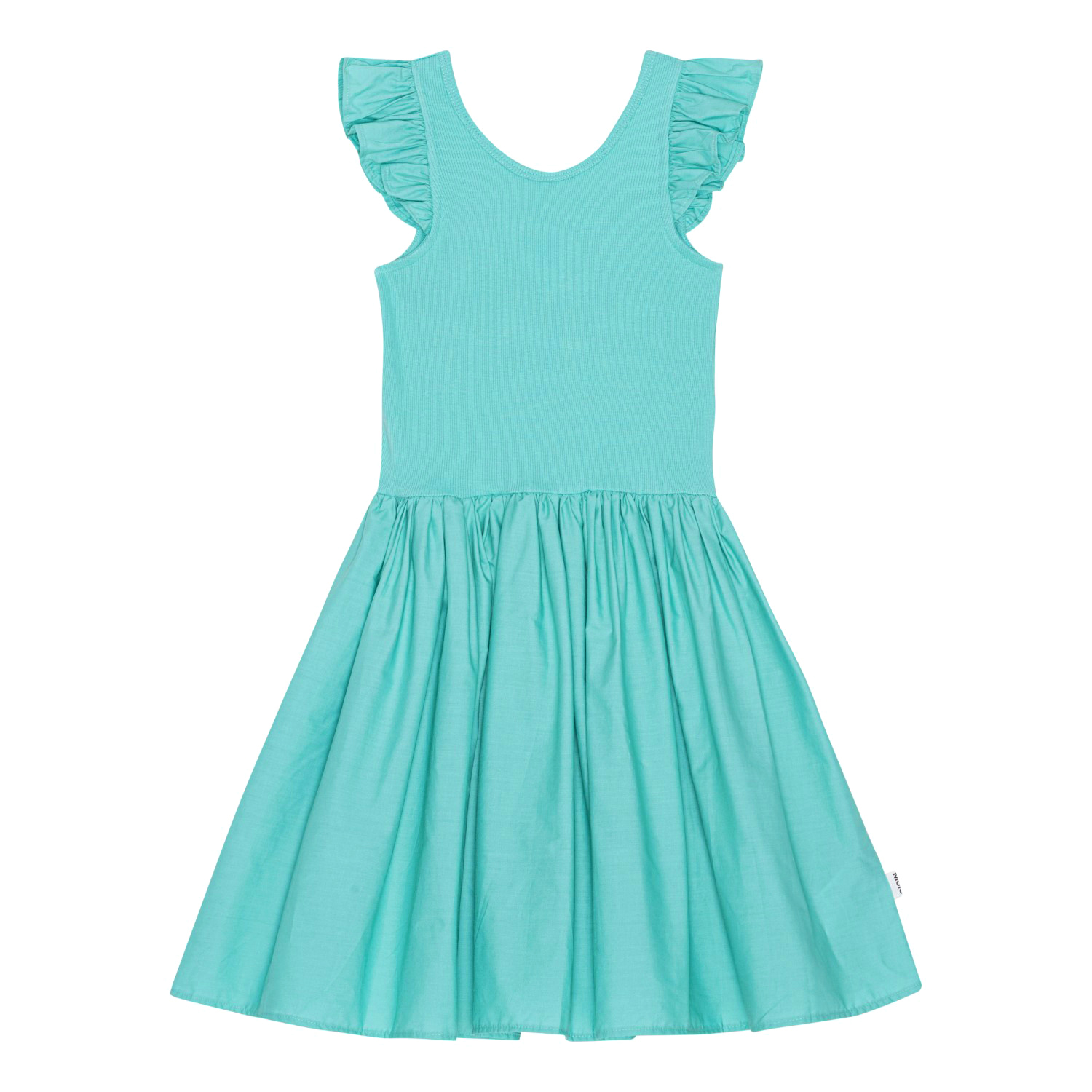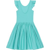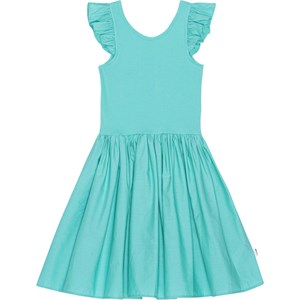 Turquoise knielange jurk van biologisch katoen. Het heeft een cirkelrok en een poplin ruche op de schouders. De top is van ribjersey en heeft een lage achterkant.