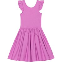 Roze knielange jurk van biologisch katoen. Het heeft een cirkelrok en een poplin ruche op de schouders. De top is van ribjersey en heeft een lage achterkant.