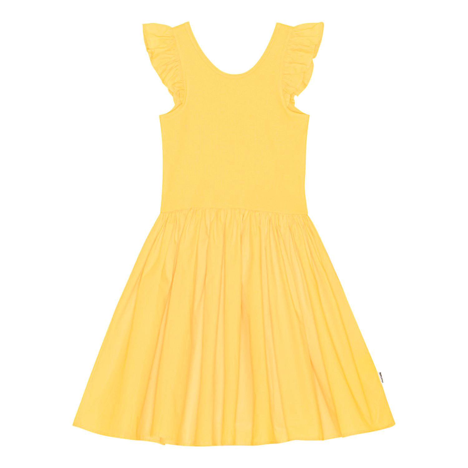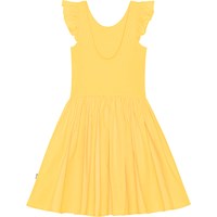 Gele knielange jurk van biologisch katoen. Het heeft een cirkelrok en een poplin ruche op de schouders. De top is van ribjersey en heeft een lage achterkant.