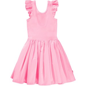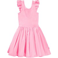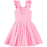 Cloudia is een roze knielange jurk van katoen. De jurk heeft een ronde poplin rok en ruches op de schouders. De top is in een rib jersey en heeft een laag uitgesneden rug.