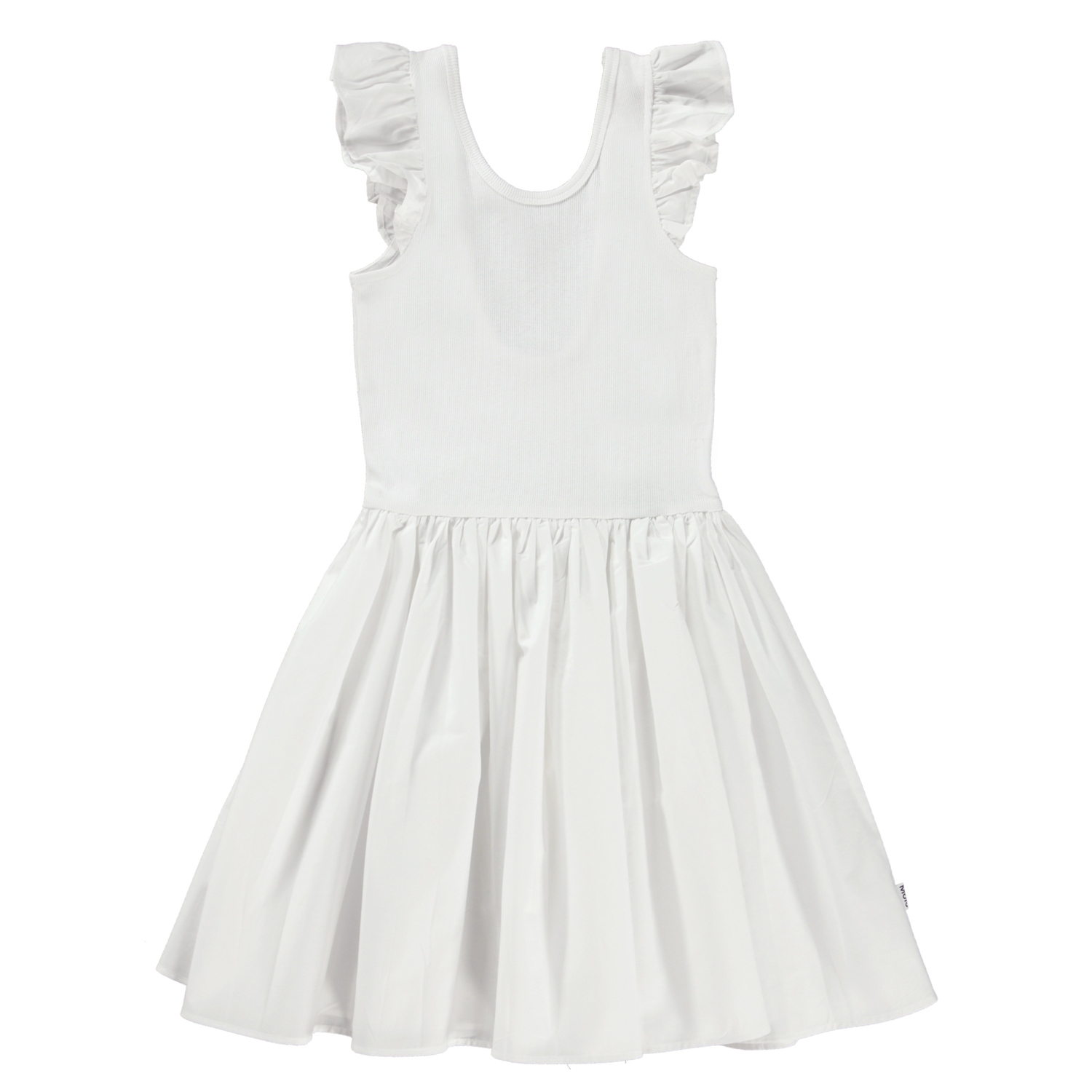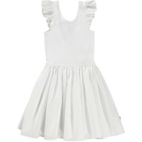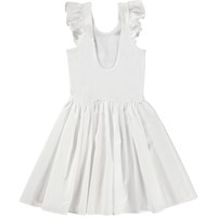 Cloudia is een witte knielange jurk van katoen. De jurk heeft een ronde poplin rok en ruches op de schouders. De top is in een rib jersey en heeft een laag uitgesneden rug.