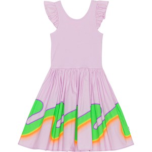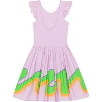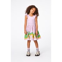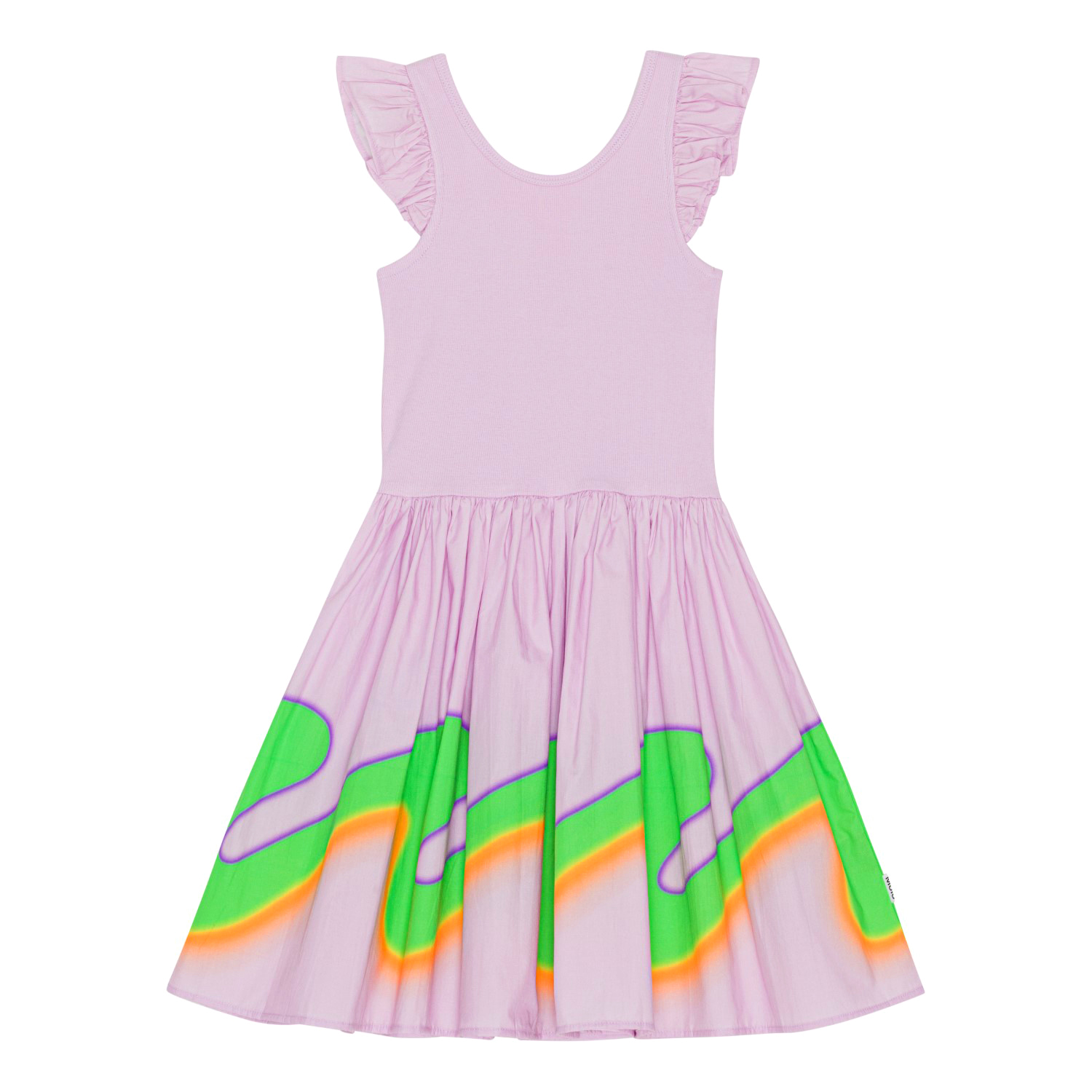 Paarse knielange jurk van biologisch katoen. Het heeft een cirkelrok en een poplin ruche op de schouders. De top is van ribjersey en heeft een lage achterkant.