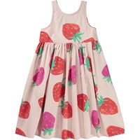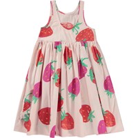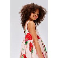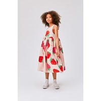 Clover is een lichtroze jurk met een aardbeienprint van biologisch katoen. De jurk heeft brede bandjes, een empire taille en een diepe rug. De rok is gerimpeld vast genaaid waardoor het heerlijk ruim valt met veel bewegingsvrijheid.