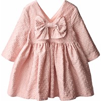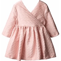 Volumineuze roze jurk met een bloemenpatroon in jacquard met een overslag v-hals aan de voorkant en een v-hals aan de achterkant met een grote decoratieve strik. De jurk heeft een driekwart mouw en een grote, geplooide rok die zorgt voor een volle en elegante uitstraling.