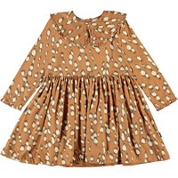 Coco is een beige jurk met een print van witte vlekken die lijkt op de vacht van een hert. De jurk heeft een prachtige grote kraag en een ritssluiting aan de achterkant.