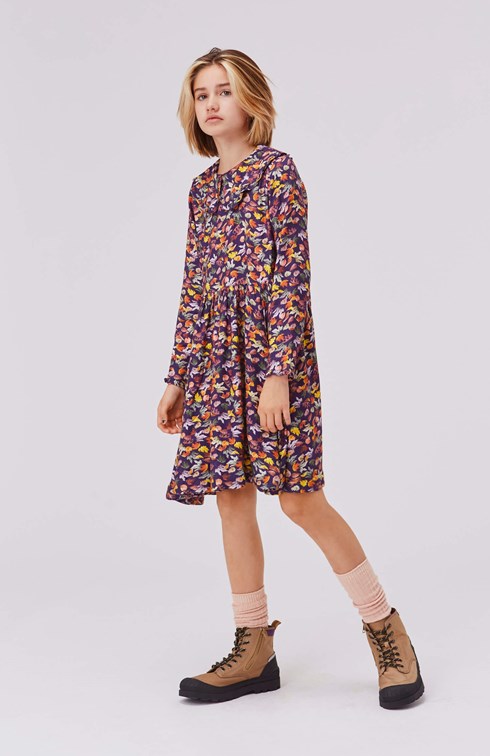 Coco is een paarse jurk met een print van bladeren in prachtige kleuren. De jurk heeft een prachtige grote kraag en een ritssluiting aan de achterkant.