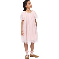 Knie-lange jurk in lichtroze tule met plooien en een lichte uitloopt. De jurk heeft korte, transparante mouwen en een strik bij de hals. Het is een fijne en luchtige jurk voor feestelijke gelegenheden.