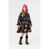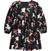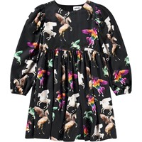 Zwarte en elegante jurk van zachte viscose. De jurk is knielengte en ruimvallend, met veel ruches aan de mouwen en rok. De lange mouwen hebben elastiek rond de polsen, wat volume aan de mouwen toevoegt. De jurk is gemakkelijk aan te trekken met de blinde rits aan de achterkant. De jurk heeft een print van vliegende Pegasus in verschillende mooie kleuren, die mooi opvalt tegen de zwarte achtergrond.
