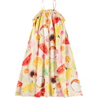 Beige ruimvallende jurk van biologisch katoen met een print van kleurrijke exotische vruchten. De jurk valt tot halverwege de kuit, heeft dunne bandjes, een diepe rug en een mooie ruche rand. Het materiaal van de jurk is licht en luchtig, waardoor het ideaal is voor naar het zwembad of het strand.