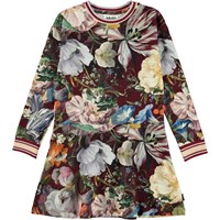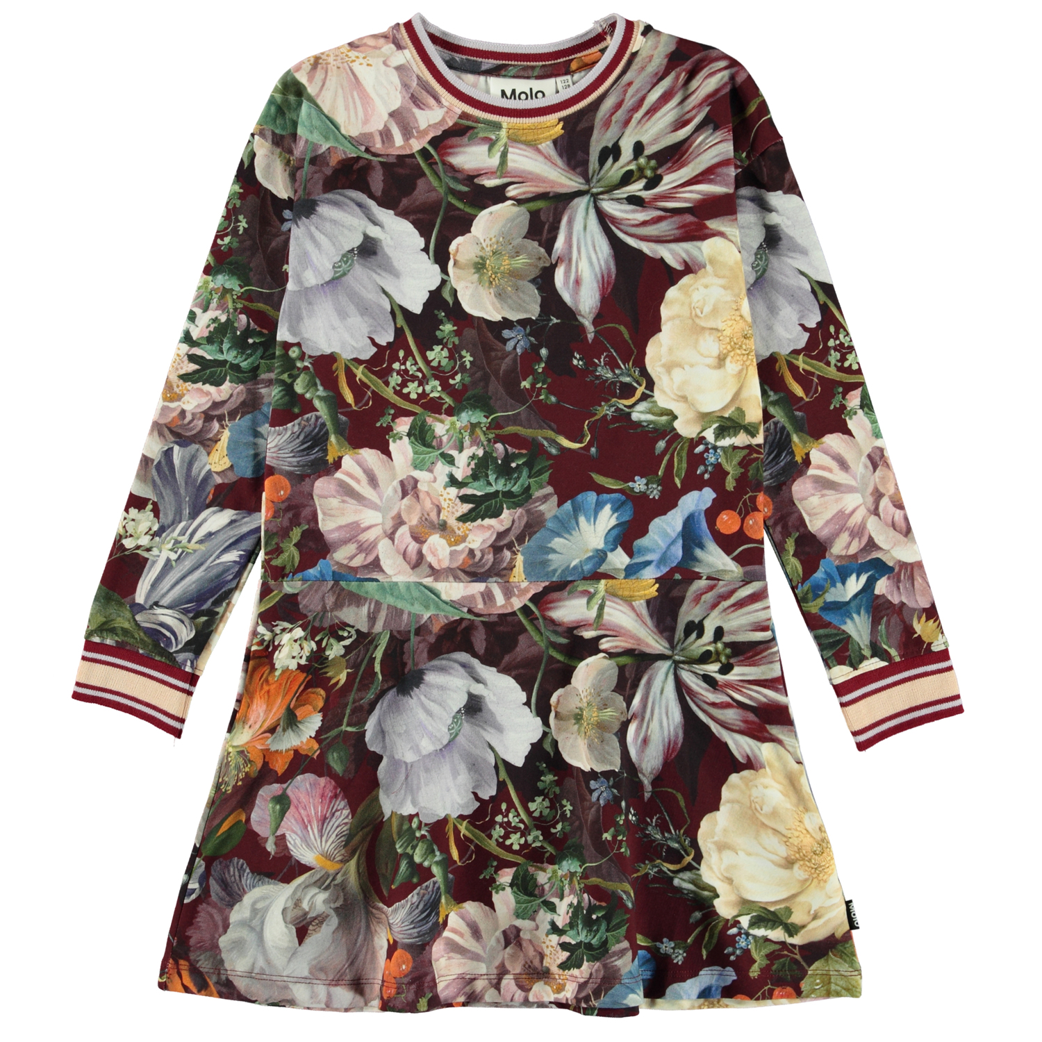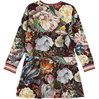 Conny is een donkerpaarse jurk met een bloemenprint. De jurk heeft lange mouwenen een gestreepte ribboord aan de hals en mouwen.