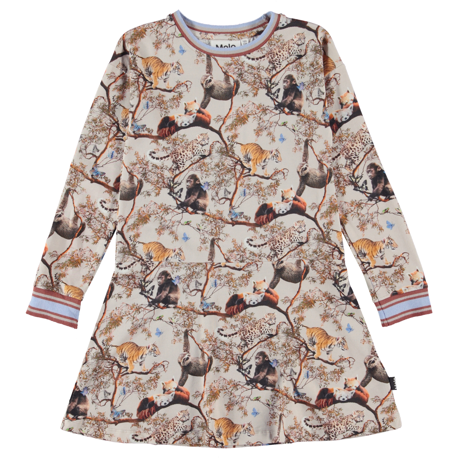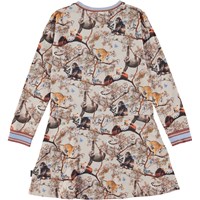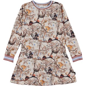 Conny is een jersey jurk van biologisch katoen met lange mouwen. De jurk heeft gestreepte ribboorden in beige, bruin en paars rond de hals en mouwen. De jurk heeft een naad op de heupen en is in de Cubs Harmony print, waarop verschillende jongen dieren staan die samen in vrede en harmonie leven.
