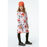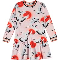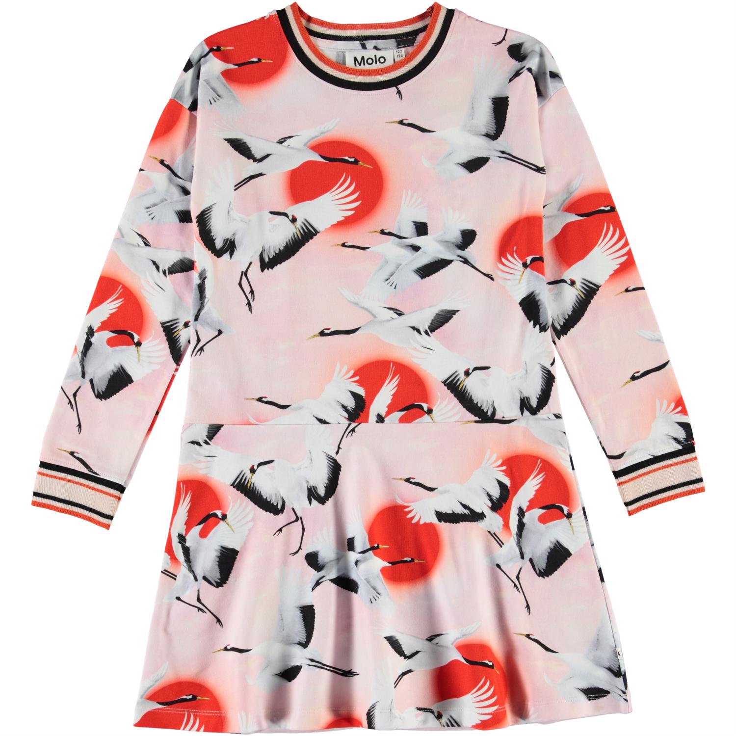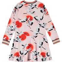 Conny is een roze jurk met een print van vliegende kraanvogels. De jurk heeft lange mouwen en een gestreepte ribboord rond de hals en mouwen.